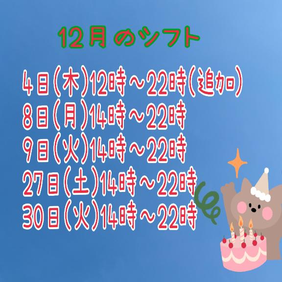 | 12月6日(土) | 次回12/18(木)出勤予定♪ |